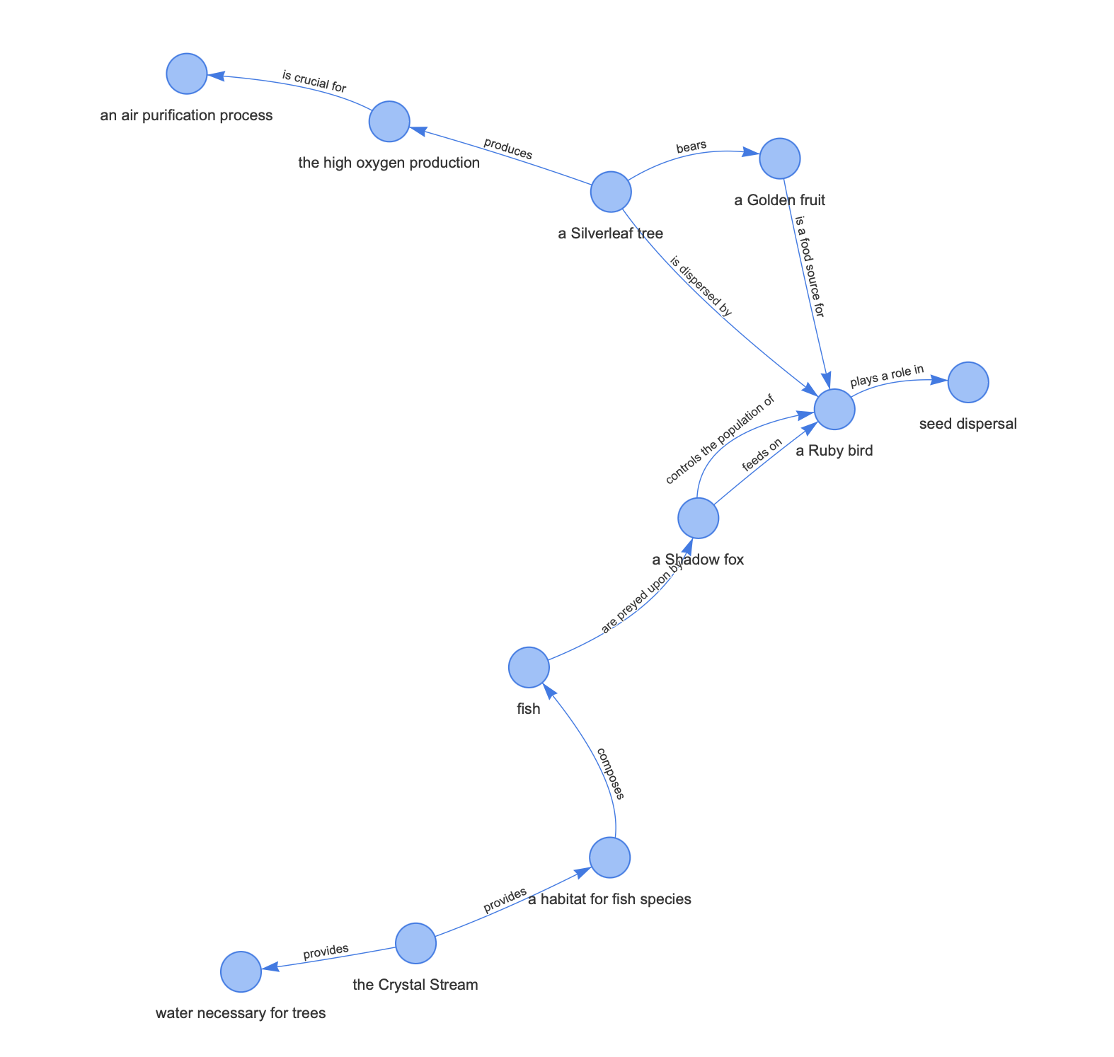 In the Greenwood ecosystem, various species interact in a delicate balance. At its core are three primary components: the Silverleaf trees, the Ruby birds, and the Shadow foxes. Silverleaf trees, known for their high oxygen production, are crucial for air purification. They bear Golden fruits, which are the main food source for the Ruby birds. These birds, characterized by their vibrant red feathers, play a vital role in seed dispersal for Silverleaf trees. Shadow foxes, elusive nocturnal creatures with dark fur, are key predators in this ecosystem. They primarily feed on Ruby birds, thus controlling their population. The ecosystem also includes a river, the Crystal Stream, which provides water for the trees and a habitat for various fish species. These fish are occasionally preyed upon by the Shadow foxes. This interdependence creates a complex web of relationships that sustain the Greenwood ecosystem, demonstrating a balance between predation and mutual benefit.